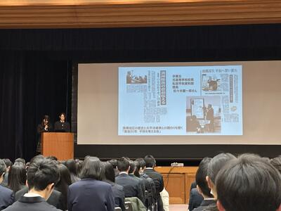 今年度は戦後80年という節目の年に当たることから、「平和な社会の実現に向けて、私たちができること」のテーマのもと、本校は代表発表校5校のうちの1校に選ばれ、11月に行われた「平和を考える会」での学んだことや考えたことをまとめ、発表をしてきました。