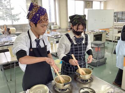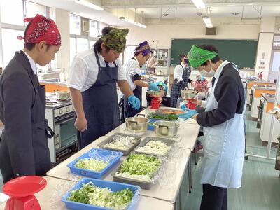 計測後は、農業の学習で栽培した野菜を実際に各自で計量しながら「地産地消!豆乳みそ汁」を作り、「あと1品」野菜を増やす方法を実践しました。