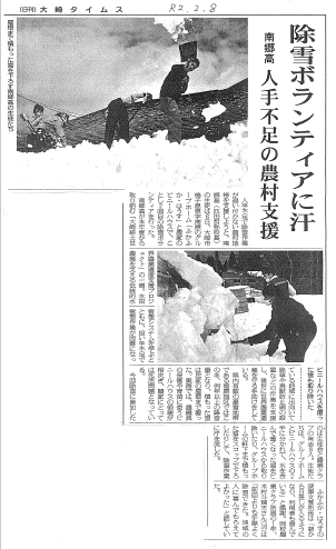 2月6日(土),生徒会・農業クラブの有志の生徒たちが,今年度最後の支援活動を行いました。県内有数の豪雪地域である大崎市鳴子温泉南原地区にて,除雪作業を行いました。前回の支援活動(1ヶ月前)にも同じ場所で除雪作業を実施しましたが,日々降り積もる雪は軒下まで積もっていました。時折,雨が降る中の活動でしたが,生徒たちは今年度最後の活動だと張り切って汗を流しました。